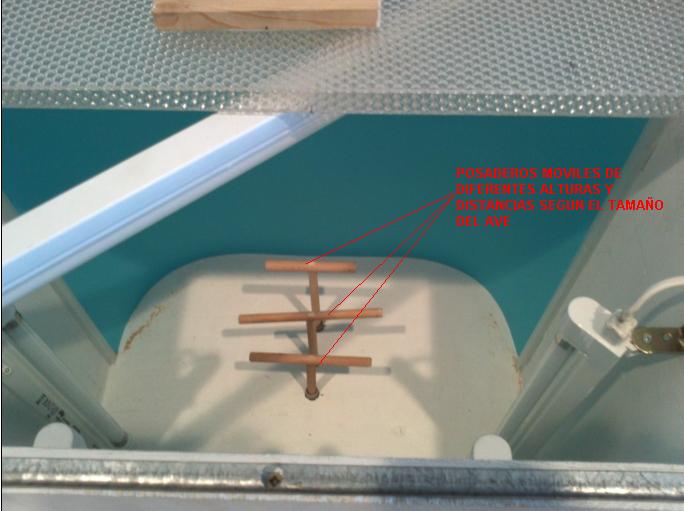 Mayo 2012. Esta es mi nueva cabina para fotografiar aves, consta de cinco fluorescentes interiores, tres fijos y dos orientables según necesidad, en la parte superior tiene dos tapas correderas translucidas, y debajo de ellas una tela metálica para poder ventilar el interior, ya que se acumula mucha temperatura debido al calor que producen los tubos fluorescentes, y a la vez evitamos que los pájaros se escapen. Tiene tres posibles perchas o posaderos con alturas y distancias al objetivo diferentes , según sea la talla de las aves a fotografiar, con posibilidad de moverlos desde el exterior, las medidas de la cabina las puedo dar si alguien las quiere, pero aconsejo, hacer la cabina con respecto a los valores de enfoque de la cámara que tenga cada uno, en mi caso tengo una Canon S5IS.